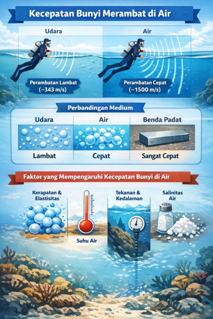 Kecepatan bunyi merambat di air dipengaruhi oleh sifat fisik medium, seperti kerapatan, elastisitas, suhu, tekanan, dan kandungan zat terlarut. Secara umum, bunyi merambat lebih cepat di air dibandingkan di udara karena partikel air lebih rapat dan mampu meneruskan getaran dengan lebih efisien. Pemahaman konsep ini penting dalam pembelajaran fisika dan penerapannya dalam teknologi serta kehidupan sehari-hari.