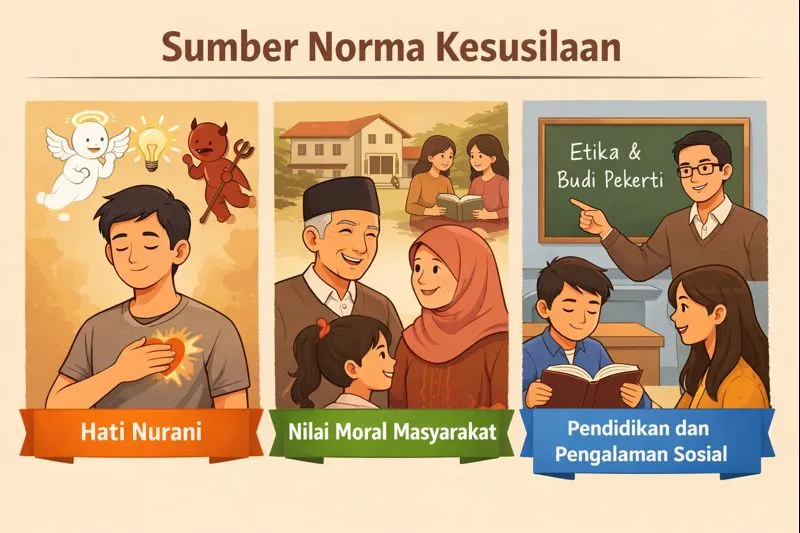 Dalam kehidupan bermasyarakat, manusia tidak pernah lepas dari aturan dan pedoman perilaku. Aturan tersebut dikenal sebagai norma, yang berfungsi menjaga ketertiban dan keharmonisan sosial. Salah satu norma yang memiliki peran penting dalam membentuk kepribadian manusia adalah norma kesusilaan. Norma ini berkaitan langsung dengan nilai moral, hati nurani, dan pandangan tentang baik dan buruk. Memahami sumber norma kesusilaan menjadi penting agar individu mampu bersikap bijaksana dalam kehidupan sehari-hari.